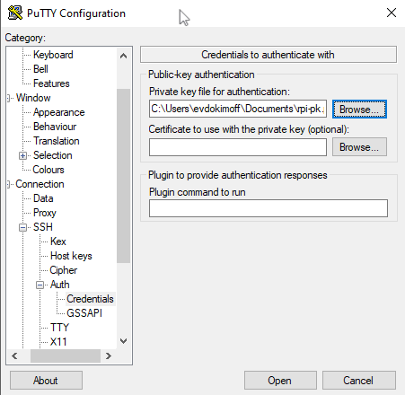В разделе Connection → SSH → Auth → Credentials нажмите “Browse” и выберите ваш .ppk файл